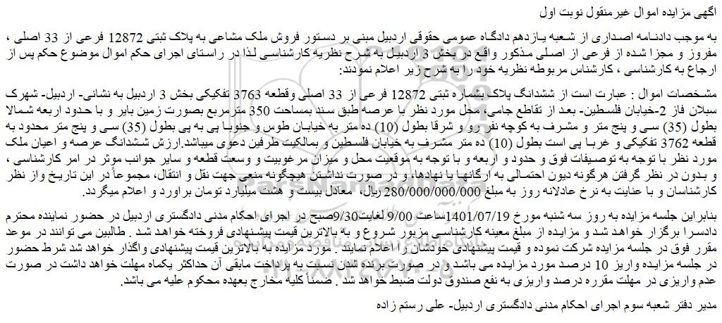 به موجب دادنامه اصداری از شعبه یازدهم دادگاه عمومی حقوقی اردبیل مبنی بر دستور فروش ملک مشاعی به پلاک ثبتی 12872 فرعی از 33 اصلی ، مفروز و مجزا شده از فرعی از اصلی مذکور واقع در بخش 3 اردبیل به شرح نظریه کارشناسی لذا در راستای اجرای حکم اموال موضوع حکم پس از ارجاع به کارشناسی ، کارشناس مربوطه نظریه خود را به شرح زیر اعلام نمودند:
