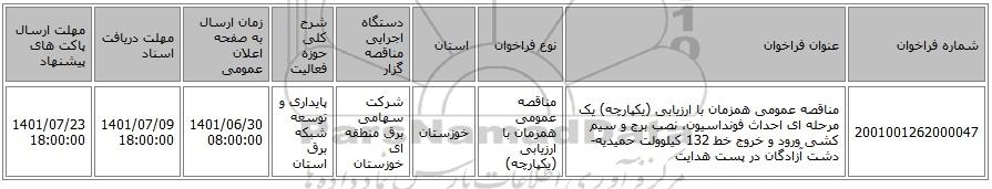 | 2001001262000047 | مناقصه عمومی همزمان با ارزیابی (یکپارچه) یک مرحله ای احداث فونداسیون، نصب برج و سیم کشی ورود و خروج خط 132 کیلوولت حمیدیه-دشت آزادگان در پست هدایت | مناقصه عمومی همزمان با ارزیابی (یکپارچه) | خوزستان | شرکت سهامی برق منطقه ای خوزستان | پایداری و توسعه شبکه برق استان | 1401/06/30 08:00:00 | 1401/07/09 18:00:00 | 1401/07/23 18:00:00 |