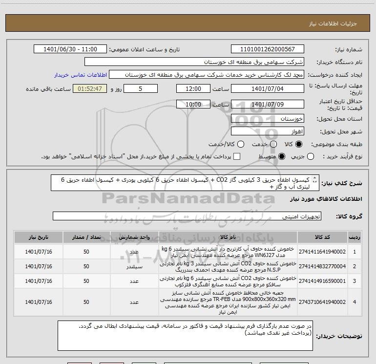 | 2 | 2741414832770004 | خاموش کننده حاوی CO2 آتش نشانی سیلندر 3 kg نام تجارتی N.S.P مرجع عرضه کننده مهدی احمدی بندرریگ | سیلندر | 50 | 1401/07/16 |
