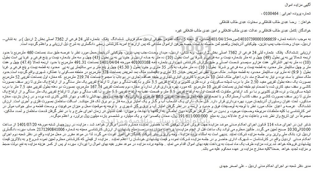 ،به موجب دادنامه شماره 140107390001066659مورخه1401/04/15صادره از شعبه 5 دادگاه عمومی حقوقی اردبیل حکم فروش  ششدانگ  پلاک  بشماره ثبتی 24 فرعی از 7362 اصلی بخش 2 اردبیل ) و  به نشانی- اردبیل- میدان وحدت-جنب پمپ بنزین- چلوکبابی آذربایجان وتقسیم ثمن حاصله به نسبت حصه طرفین ازاموال مشاعی که پس ازارجاع امربه کارشناس رسمی دادگستری به شرح ذیل ارزیابی و واعلام گردیده است.
