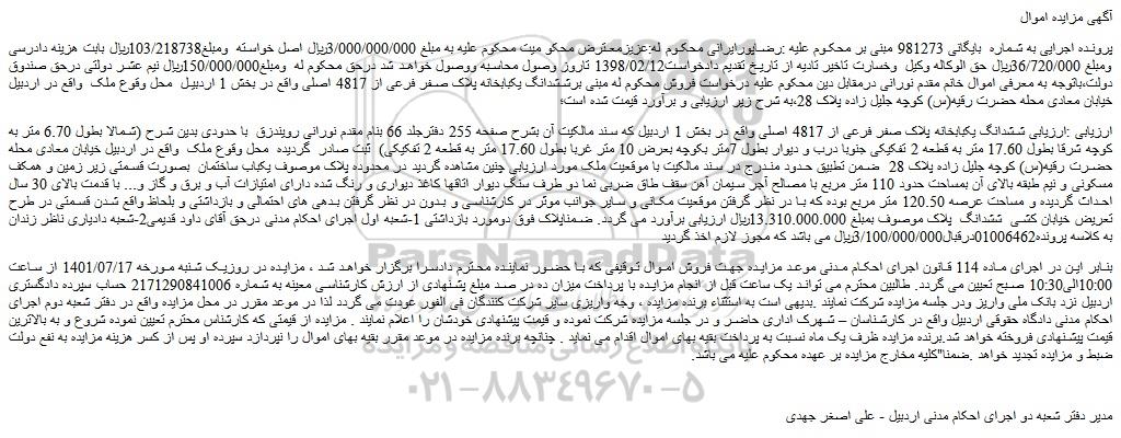 مزایده ششدانگ یکبابخانه پلاک صفر فرعی از 4817 اصلی , مزایده ششدانگ یکبابخانه پلاک صفر فرعی از 4817 اصلی
