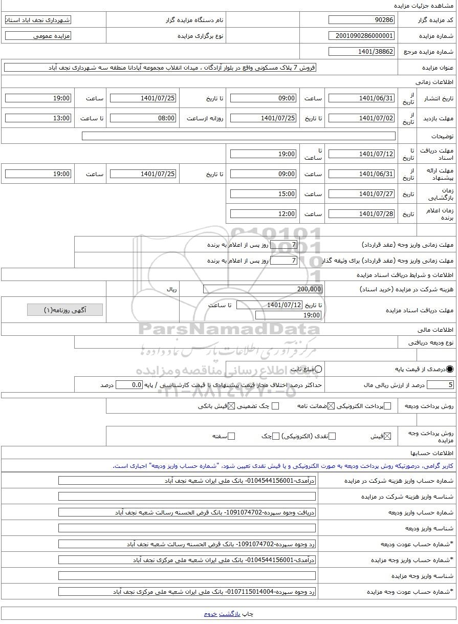 | عنوان مزایده | فروش 7 پلاک مسکونی واقع در بلوار آزادگان ، میدان انقلاب مجموعه آپادانا منطقه سه شهرداری نجف آباد -مزایده زمین - استان اصفهان | |||