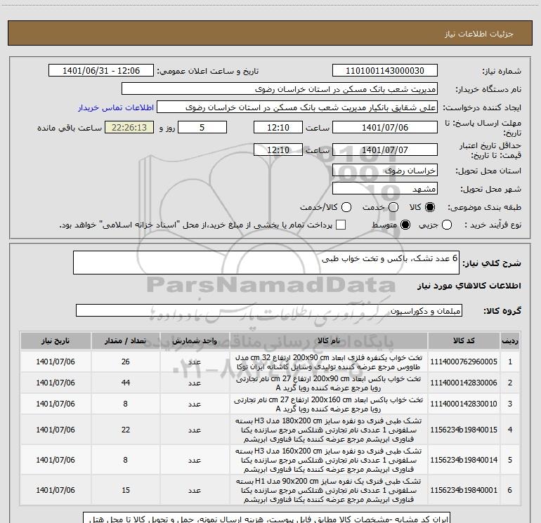 شرح کلی نیاز: 6 عدد تشک، باکس و تخت خواب طبی