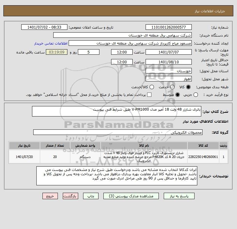 شرح کلی نیاز: باتری شارژر 48 ولت 18 آمپر مدل V-PM1000 طبق شرایط فنی پیوست