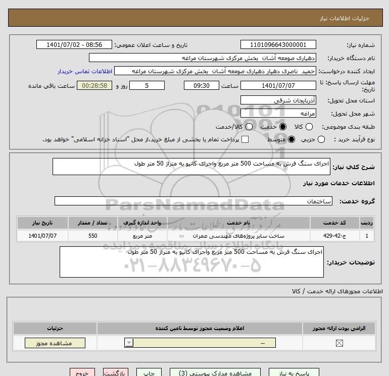 شرح کلی نیاز: اجرای سنگ فرش به مساحت 500 متر مربع واجرای کانیو به متراژ 50 متر طول