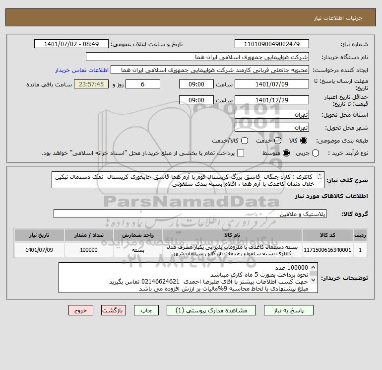 شرح کلی نیاز: کاتلری : کارد چنگال قاشق بزرگ کریستال فوم با آرم هما قاشق چایخوری کریستال نمک دستمال نپکین خلال دندان کاغذی با آرم هما ، اقلام بسته بندی سلفونی