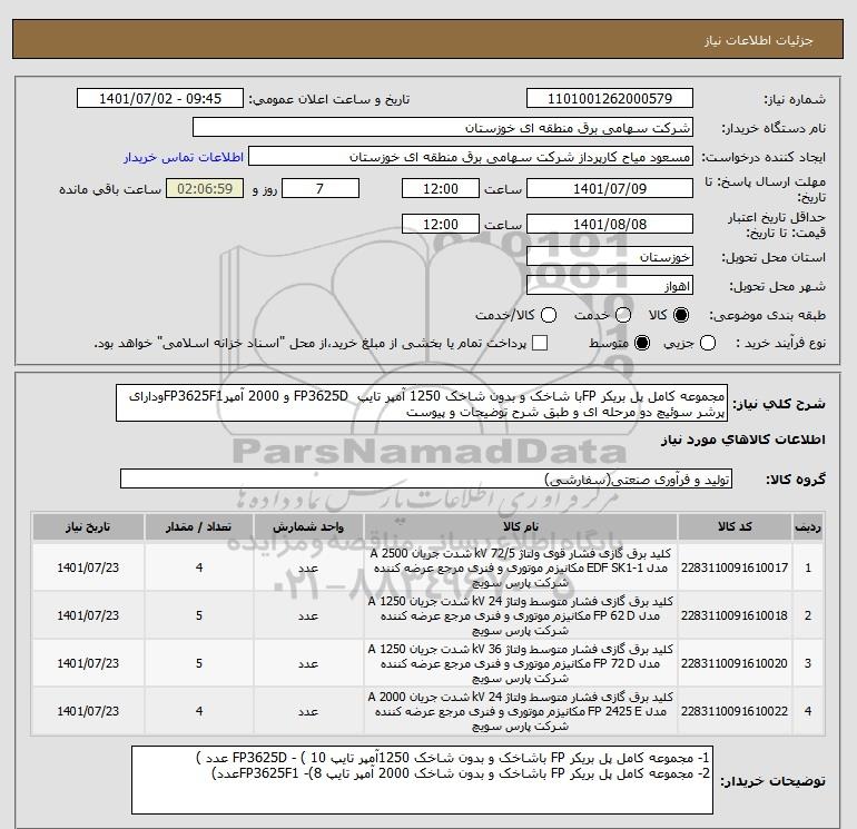 | 4 | 2283110091610022 | کلید برق گازی فشار متوسط ولتاژ 24 kV شدت جریان 2000 A مدل FP 2425 E مکانیزم موتوری و فنری مرجع عرضه کننده شرکت پارس سویچ | عدد | 4 | 1401/07/23 |