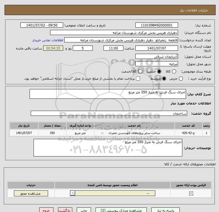 شرح کلی نیاز: اجرای سنگ فرش به متراژ 350 متر مربع