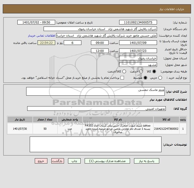 نام دستگاه خریدار:شرکت پالایش گاز شهید هاشمی نژاد استان خراسان رضوی