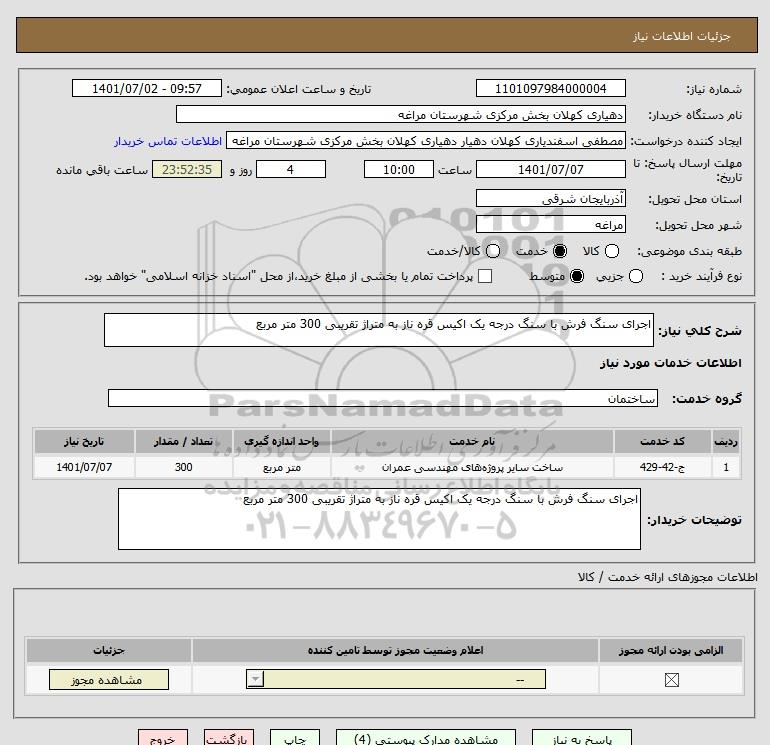 شرح کلی نیاز: اجرای سنگ فرش با سنگ درجه یک اکیس قره ناز به متراژ تقریبی 300 متر مربع