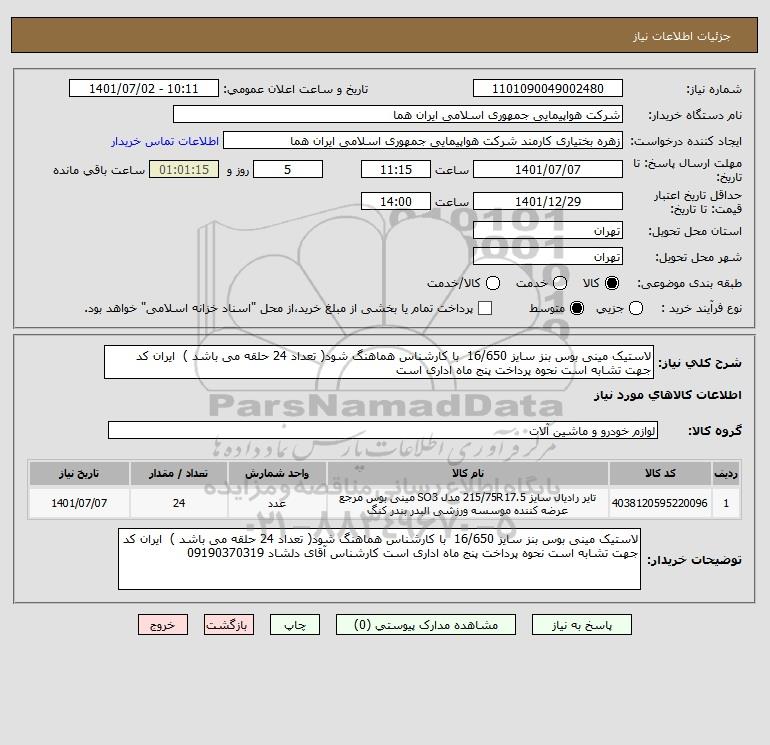 شرح کلی نیاز: لاستیک مینی بوس بنز سایز 16/650 با کارشناس هماهنگ شود( تعداد 24 حلقه می باشد ) ایران کد جهت تشابه است نحوه پرداخت پنج ماه اداری است
