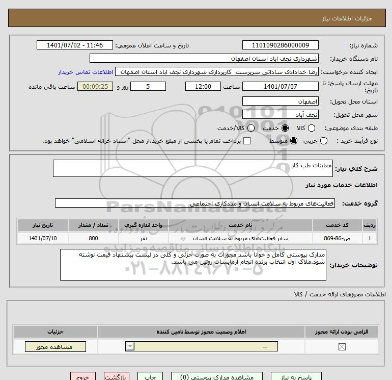 توضیحات خریدار:مدارک پیوستی کامل و خوانا باشد مجوزات به صورت جزئی و کلی در لیست پیشنهاد قیمت نوشته شود.ملاک اول انتخاب برنده انجام آزمایشات روتین می باشد.