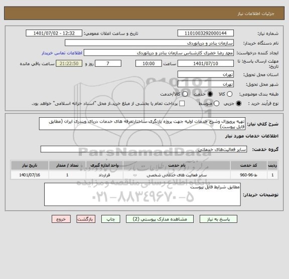 استعلام بها و موضوع استعلام استعلام تهیه پروپوزال وشرح خدمات اولیه جهت پروژه بازنگری ساختارتعرفه های خدمات دریای وبندری ایران (مطابق فایل پیوست) به اطلاع کلیه شرکت‌ها و افراد متخصص واجد شرایط می‌رساند، آگهی گذار در نظر دارد از طریق استعلام بها، نسبت به انتخاب و دریافت پیشنهادات اقدام نماید. این استعلام با کد آگهی ثبت شده در سامانه خبرگزاری پارس نماد : 4965531 منتشر شده است. مشخصات استعلام : تاریخ شروع استعلام: 1401/07/02 آخرین مهلت ارسال پیشنهاد قیمت : 1401/07/10 و محل اجرای پروژه : استان تهران میباشد. استعلام قیمت مورد درخواست : استعلام تهیه پروپوزال وشرح خدمات اولیه جهت پروژه بازنگری ساختارتعرفه های خدمات دریای وبندری ایران (مطابق فایل پیوست) با دسته‌بندی‌های تخصصی و گروه های مرتبط : کلیه خدمات و تجهیزات پروژه های دریایی-اسکله،موج شکن ، مشاوره سازه های دریایی -, استعلام اطلاع رسانی میگردد.