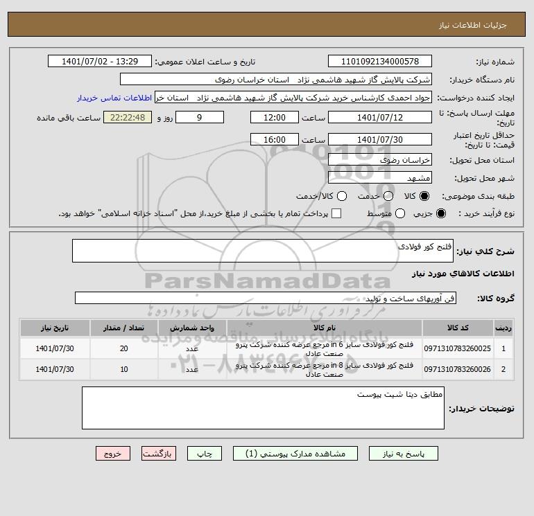 | 2 | 0971310783260026 | فلنج کور فولادی سایز 8 in مرجع عرضه کننده شرکت پترو صنعت عادل | عدد | 10 | 1401/07/30 |