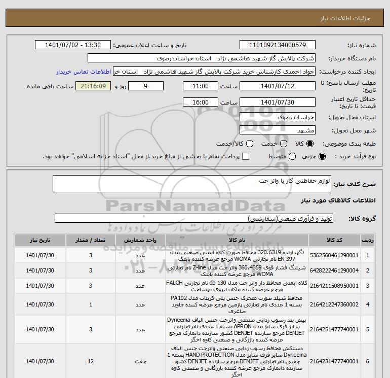 نام دستگاه خریدار:شرکت پالایش گاز شهید هاشمی نژاد استان خراسان رضوی