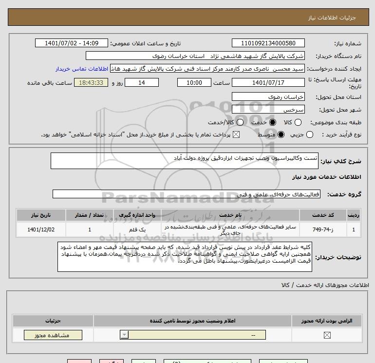 شرح کلی نیاز: تست وکالیبراسیون ونصب تجهیزات ابزاردقیق پروژه دولت آباد