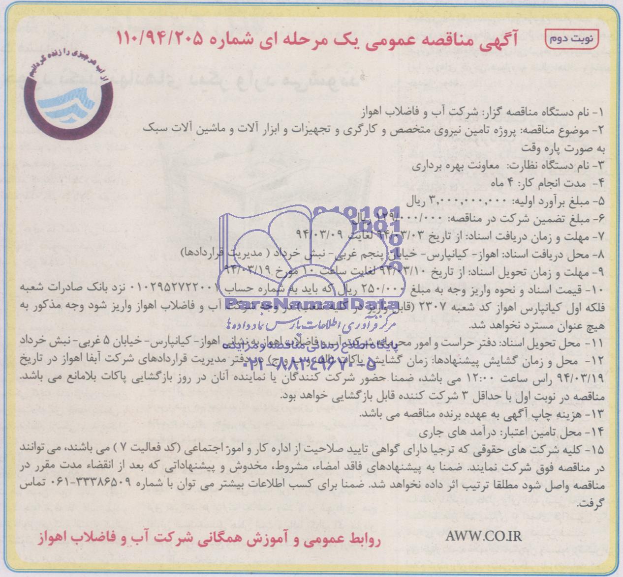 مناقصه تامین نیروی متخصص و کارگری و تجهیزات و ابزار آلات و ماشین آلات سبک از کلیه افراد متخصص و شرکتها واجد شرایط دعوت به عمل میآید در مناقصه با کد خبرگزاری پارس نماد: 496635 شرکت نمایند.