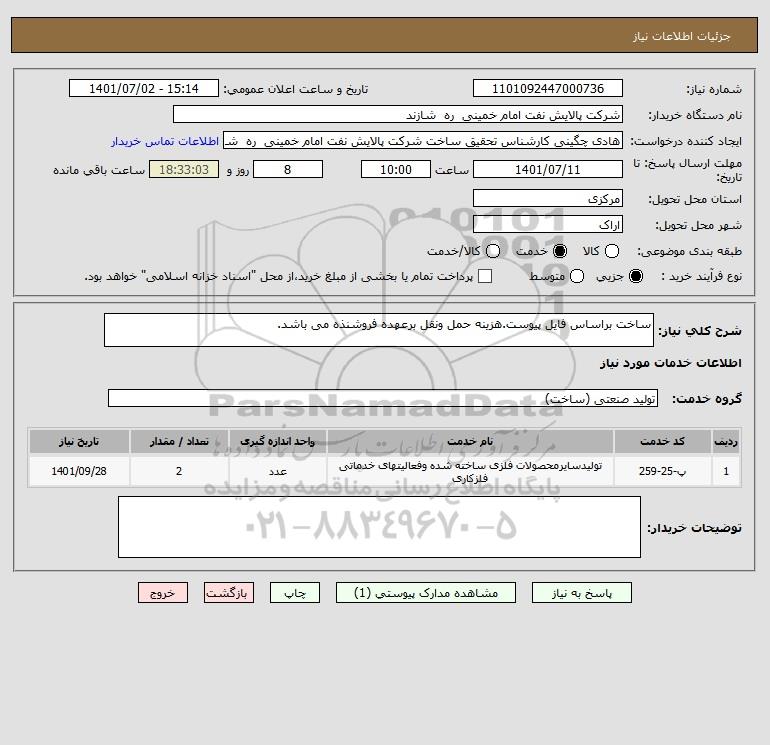 شرح کلی نیاز: ساخت براساس فایل پیوست.هزینه حمل ونقل برعهده فروشنذه می باشد.