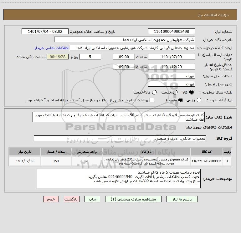 شرح کلی نیاز: کتری آلو منیومی 4 و 6 و 8 لیتری - هر کدام 50عدد - ایران کد انتخاب شده صرفا جهت تشابه با کالای مورد نظر میباشد