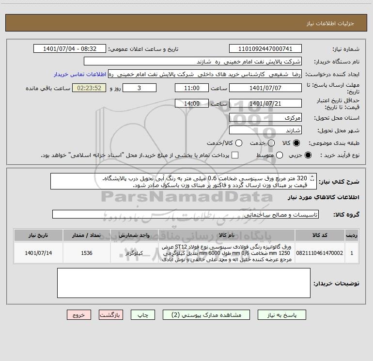 شرح کلی نیاز: 320 متر مربع ورق سینوسی ضخامت 0.6 میلی متر به رنگ آبی تحویل درب پالایشگاه.