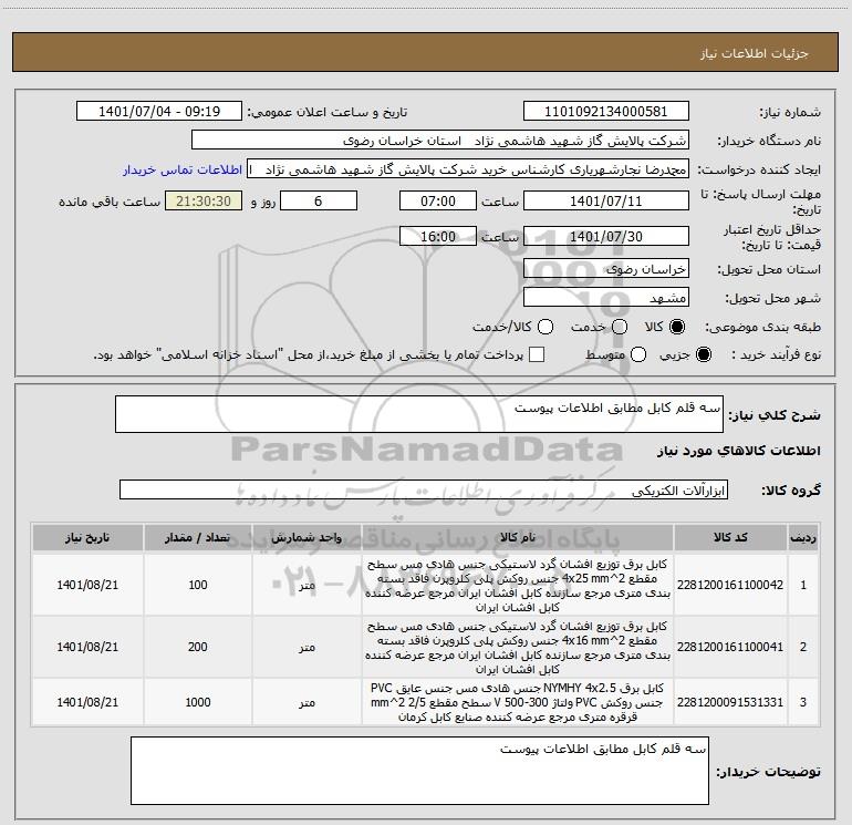 شرح کلی نیاز: سه قلم کابل مطابق اطلاعات پیوست