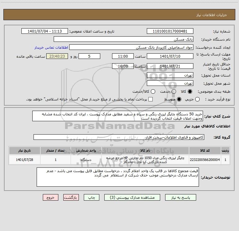 شرح کلی نیاز: خرید 50 دستگاه چاپگر لیزری رنگی و سیاه و سفید مطابق مدارک پیوست ، ایران کد انتخاب شده مشابه وجهت اعلان قیمت انتخاب گردیده است
