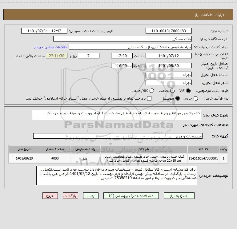 شرح کلی نیاز: کیف پالتویی مردانه چرم طبیعی به همراه جعبه طبق مشخصات قرارداد پیوست و نمونه موجود در بانک