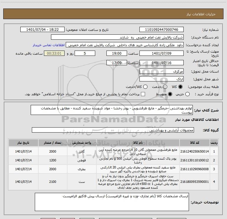 شرح کلی نیاز: لوازم بهداشتی -جرمگیر - مایع ظرفشویی - پودر رخشا - مواد شوینده سفید کننده - مطابق با مشخصات پیوست