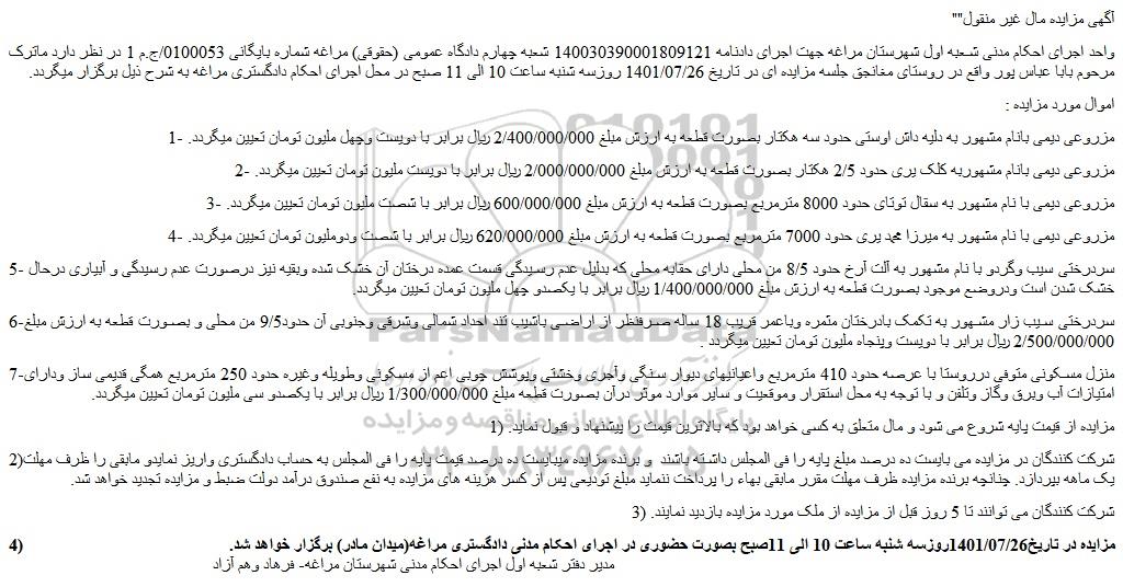 واحد اجرای احکام مدنی شعبه اول شهرستان مراغه جهت اجرای دادنامه 140030390001809121 شعبه چهارم دادگاه عمومی (حقوقی) مراغه شماره بایگانی 0100053/ج.م 1 در نظر دارد ماترک مرحوم بابا عباس پور واقع در روستای مغانجق جلسه مزایده ای در تاریخ 1401/07/26 روزسه شنبه ساعت 10 الی 11 صبح در محل اجرای احکام دادگستری مراغه به شرح ذیل برگزار میگردد.