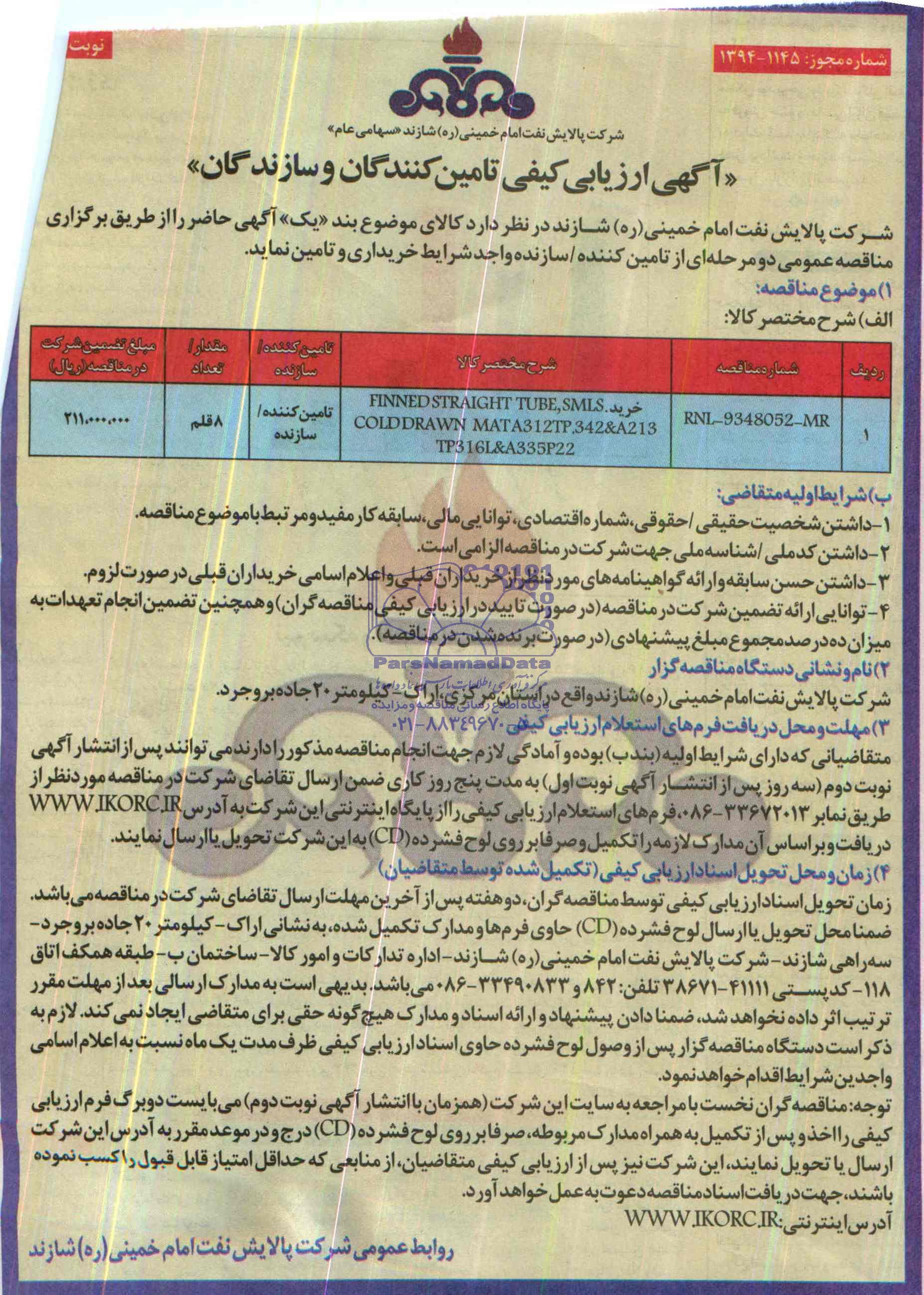 خرید FINNED STRAIGHT TUBE, SMLS COLDDRAWN MATA312TP.342&213 TP3161&A335P22ارزیابی کیفی تامین کنندگان و سازندگان از کلیه افراد متخصص و شرکتها واجد شرایط دعوت به عمل میآید در مناقصه با کد خبرگزاری پارس نماد: 497145 شرکت نمایند.