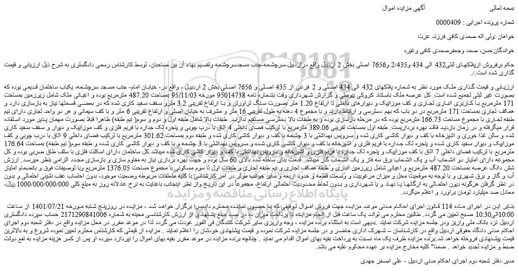 مزایده فروش ملک به شماره پلاکهای 432 الی 434 اصلی و 2 فرعی از 435 اصلی و 7656 اصلی , مزایده فروش ملک به شماره پلاکهای 432 الی 434 اصلی و 2 فرعی از 435 اصلی و 7656 اصلی