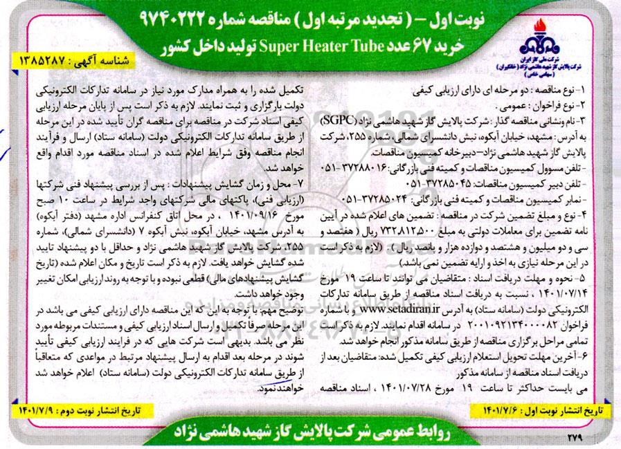 تجدید مناقصه خرید 67 عدد Super Heater Tube تولید داخل کشور از کلیه افراد متخصص و شرکتها واجد شرایط دعوت به عمل میآید در مناقصه با کد خبرگزاری پارس نماد: 4971910 شرکت نمایند.