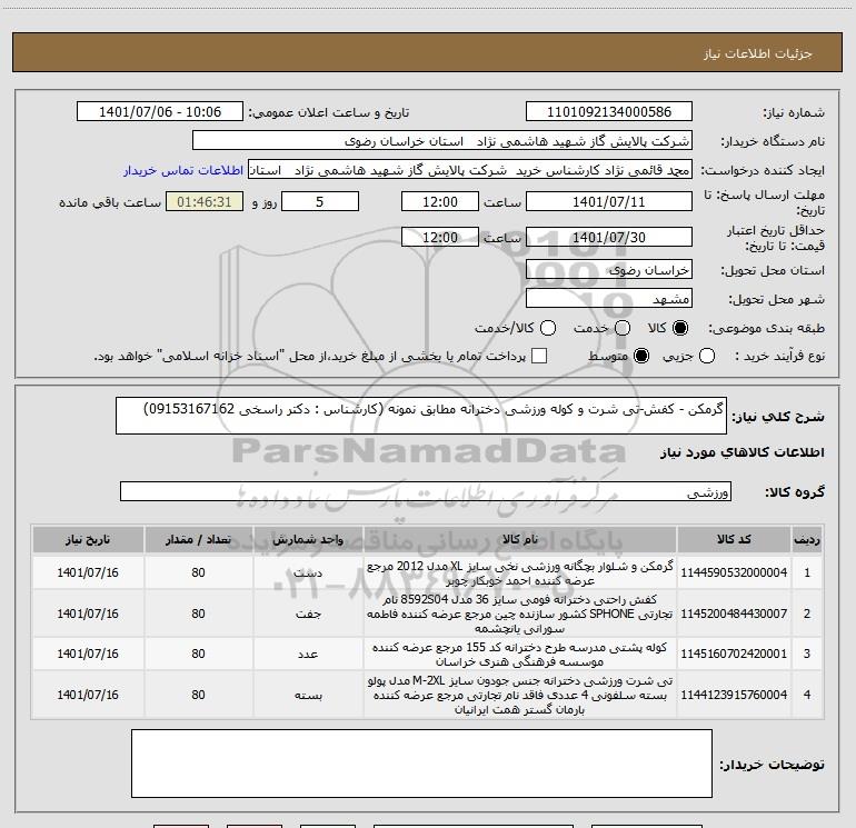 نام دستگاه خریدار:شرکت پالایش گاز شهید هاشمی نژاد استان خراسان رضوی