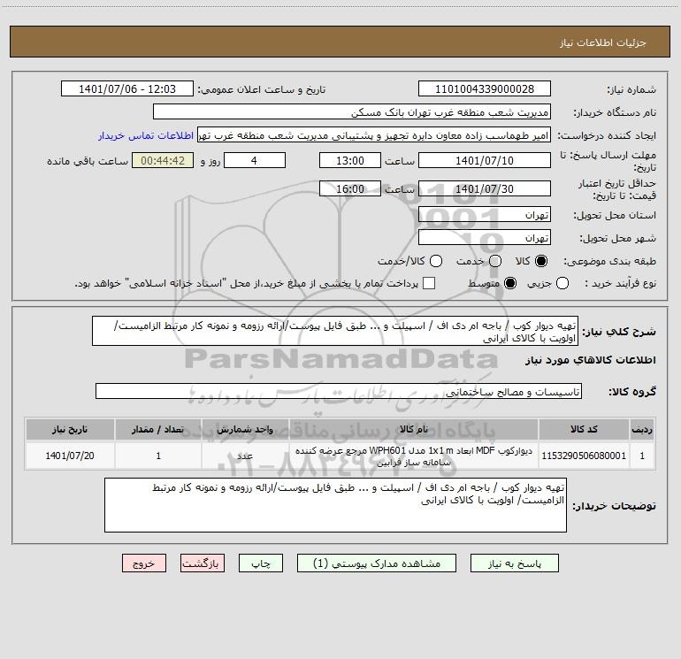 شرح کلی نیاز: تهیه دیوار کوب / باجه ام دی اف / اسپیلت و ... طبق فایل پیوست/ارائه رزومه و نمونه کار مرتبط الزامیست/ اولویت با کالای ایرانی