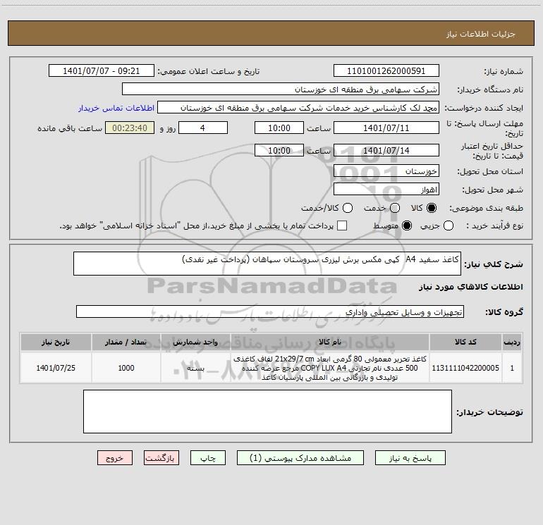 شرح کلی نیاز: کاغذ سفید A4 کپی مکس برش لیزری سروستان سپاهان (پرداخت غیر نقدی)