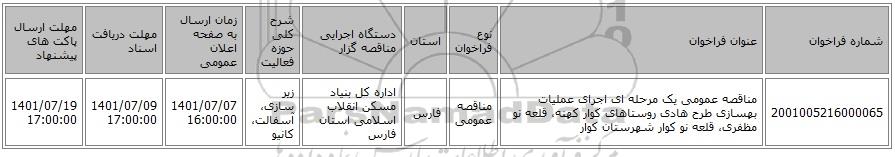 | 2001005216000065 | مناقصه عمومی یک مرحله ای اجرای عملیات بهسازی طرح هادی روستاهای کوار کهنه، قلعه نو مظفری، قلعه نو کوار شهرستان کوار | مناقصه عمومی | فارس | اداره کل بنیاد مسکن انقلاب اسلامی استان فارس | زیر سازی، آسفالت، کانیو | 1401/07/07 16:00:00 | 1401/07/09 17:00:00 | 1401/07/19 17:00:00 |