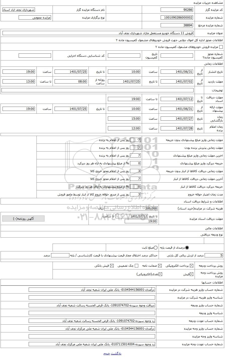 | شماره حساب عودت وجه مزایده | رد وجوه سپرده-0107115014004- بانک ملی ایران شعبه ملی مرکزی نجف آباد |
