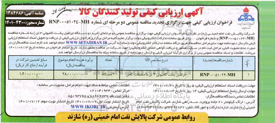 شرکت پالایش نفت امام خمینی (ره) در نظر دارد فراخوان ارزیابی کیفی جهت برگزاری مناقصه عمومی دو مرحله ای (خرید دو دستگاه جرثقیل پشت کامیونی 3 تن ) به شماره مناقصه (RNp - 0051024-MH) و شماره فراخوان... را از طریق سامانه تدارکات الکترونیکی دولت برگزار نماید. کلیه مراحل برگزاری فراخوان ارزیابی کیفی از دریافت و تحویل اسناد استعلام ارزیابی کیفی تا ارسال دعوتنامه جهت سایر مراحل مناقصه از طریق درگاه سامانه تدارکات الکترونیکی دولت ستاد به آدرس ستاد ایران انجام خواهد شد. لازم است مناقصه گران در صورت عدم عضویت قبلی مراحل ثبت نام در سایت مذکور و دریافت گواهی امضای الکترونیکی را جهت شرکت در مناقصه محقق سازند. تاریخ انتشار فراخوان در سامانه تاریخ 1401.7.13 می باشد. اطلاعات و اسناد مناقصه عمومی پس از برگزاری فرآیند ارزیابی کیفی و ارسال دعوتنامه از طریق سامانه ستاد به مناقصه گران ارسال خواهد شد.