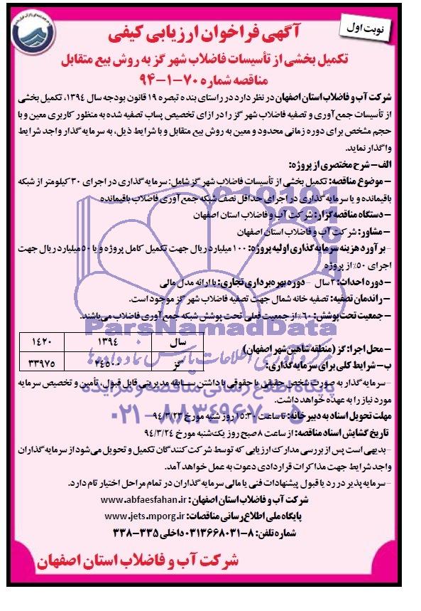 شرکت آب و فاضلاب استان اصفهان در نظر دارد در راستای بنده تبصره 19 قانون بودجه سال 1394 ، تکمیل بخشی از تاسیسات جمع آوری و تصفیه فاضلاب شهر گز را در ازای تخصیص پساب تصفیه شده به منظور کاربری معین و با حجم مشخص برای دوره زمانی محدود و معین به روش بیع متقابل و با شرایط ذیل، به سرمایه گذار واجد شرایط واگذار نماید.