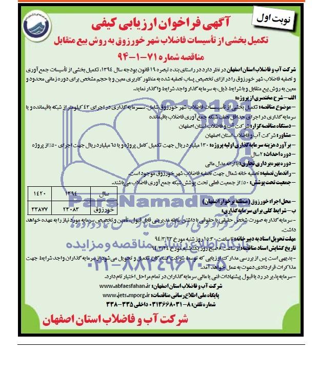 شرکت آب و فاضلاب استان اصفهان در نظر دارد در راستای بنده تبصره 19 قانون بودجه سال 1394 ، تکمیل بخشی از تاسیسات جمع آوری و تصفیه فاضلاب شهر خورزوق را در ازای تخصیص پساب تصفیه شده به منظور کاربری معین و با حجم مشخص برای دوره زمانی محدود و معین به روش بیع متقابل و با شرایط ذیل، به سرمایه گذار واجد شرایط واگذار نماید.