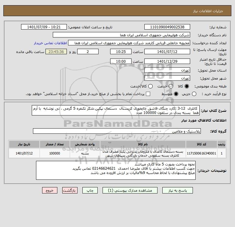 شرح کلی نیاز: کاتلری 12-3 :کارد چنگال قاشق چایخوری کریستال دستمال نپکین شکر تکنفره 5 گرمی ، نی نوشابه با آرم هما بسته بندی در سلفون 100000 عدد