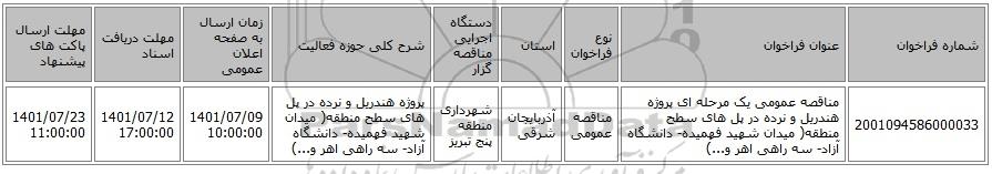 | 2001094586000033 | مناقصه عمومی یک مرحله ای پروژه هندریل و نرده در پل های سطح منطقه( میدان شهید فهمیده- دانشگاه آزاد- سه راهی اهر و...) | مناقصه عمومی | آذربایجان شرقی | شهرداری منطقه پنج تبریز | پروژه هندریل و نرده در پل های سطح منطقه( میدان شهید فهمیده- دانشگاه آزاد- سه راهی اهر و...) | 1401/07/09 10:00:00 | 1401/07/12 17:00:00 | 1401/07/23 11:00:00 |
