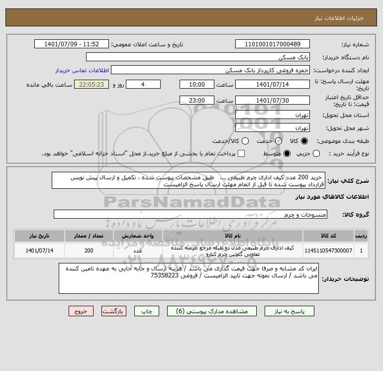 شرح کلی نیاز: خرید 200 عدد کیف اداری چرم طبیعی ... طبق مشخصات پیوست شده ، تکمیل و ارسال پیش نویس قرارداد پیوست شده تا قبل از اتمام مهلت ارسال پاسخ الزامیست