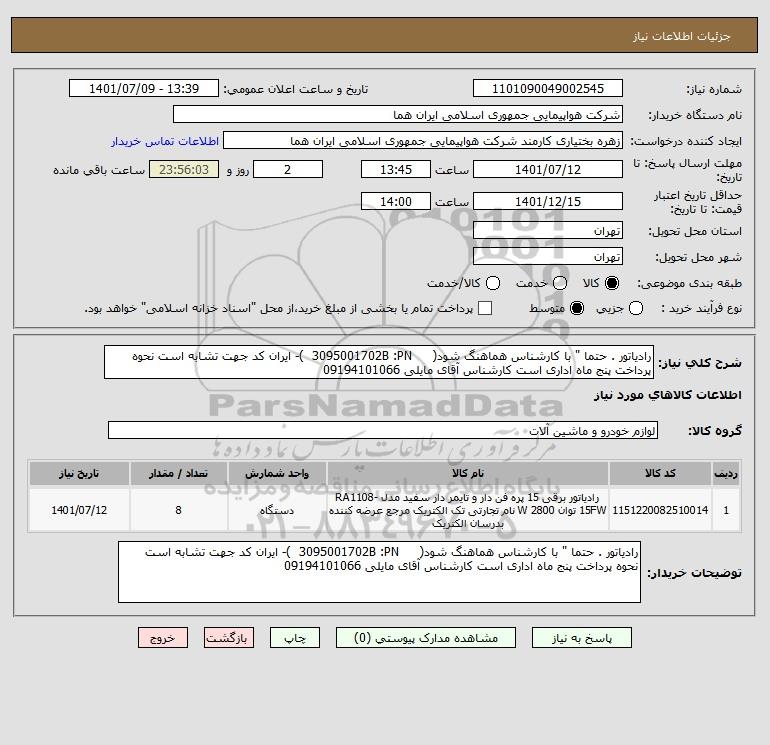 شرح کلی نیاز: رادیاتور . حتما " با کارشناس هماهنگ شود( 3095001702B :PN )- ایران کد جهت تشابه است نحوه پرداخت پنج ماه اداری است کارشناس آقای مایلی 09194101066