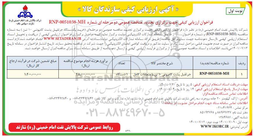 فراخوان ارزیابی کیفی جهت برگزاری تجدید مناقصه عمومی دو مرحله ای شماره RNP- 0051038-MH