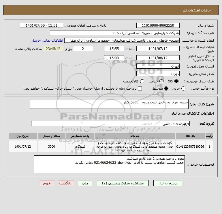 شرح کلی نیاز: سینه مرغ بی خس بدون چربی 3000 کیلو