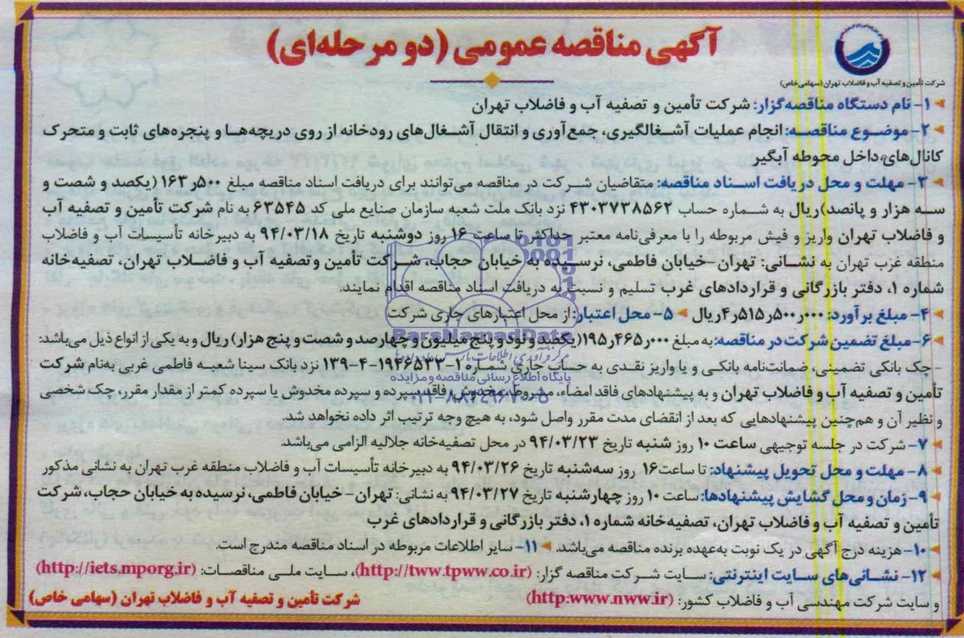 مهلت و محل دریافت اسناد مناقصه: متقاضیان شرکت در مناقصه می توانند برای دریافت اسناد مناقصه مبلغ 163.500 (یکصد و شصت و سه هزار و پانصد) ریال به شماره حساب 4303738562 نزد بانک ملت شعبه سازمان صنایع ملی کد 63545 به نام شرکت تامین و تصفیه آب و فاضلاب تهران واریز و فیش مربوطه را با معرفی نامه معتبر حداکثر تا ساعت 16 روز دوشنبه مورخ 94.3.18 به دبیرخانه تاسیسات آب و فاضلاب منطقه غرب تهران به نشانی : خیابان فاطمی - نرسیده به خیابان حجاب , شرکت تامین و تصفیه آب و فاضلاب تهران , تصفیه خانه شماره 1 دفتر بازرگانی و قراردادهای غرب تسلیم و نسبت به دریافت اسناد مناقصه اقدام نمایند