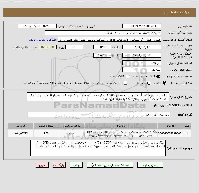 شرح کلی نیاز: رنگ سفید ترافیکی آسفالتی سرد مقدار 700 کیلو گرم - تینر مخصوص رنگ ترافیکی مقدار 250 لیتر/ ایران کد مشابه است / تحویل درپالایشگاه با هزینه فروشنده