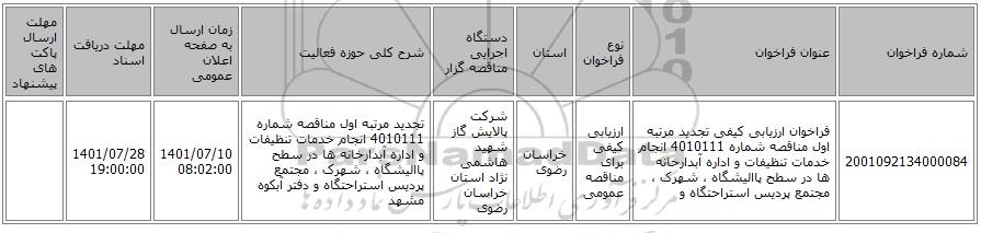 | 2001092134000084 | فراخوان ارزیابی کیفی تجدید مرتبه اول مناقصه شماره 4010111 انجام خدمات تنظیفات و اداره آبدارخانه ها در سطح پاالیشگاه ، شهرک ، مجتمع پردیس استراحتگاه و | ارزیابی کیفی برای مناقصه عمومی | خراسان رضوی | شرکت پالایش گاز شهید هاشمی نژاد استان خراسان رضوی | تجدید مرتبه اول مناقصه شماره 4010111 انجام خدمات تنظیفات و اداره آبدارخانه ها در سطح پاالیشگاه ، شهرک ، مجتمع پردیس استراحتگاه و دفتر آبکوه مشهد | 1401/07/10 08:02:00 | 1401/07/28 19:00:00 |