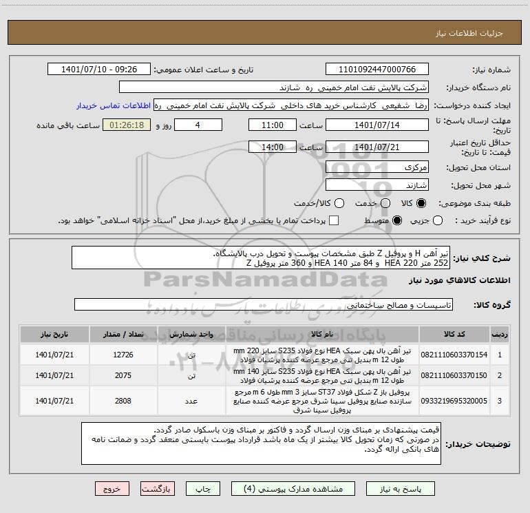 شرح کلی نیاز: تیر آهن H و پروفیل Z طبق مشخصات پیوست و تحویل درب پالایشگاه. 252 متر HEA 220 و 84 متر HEA 140 و 360 متر پروفیل Z